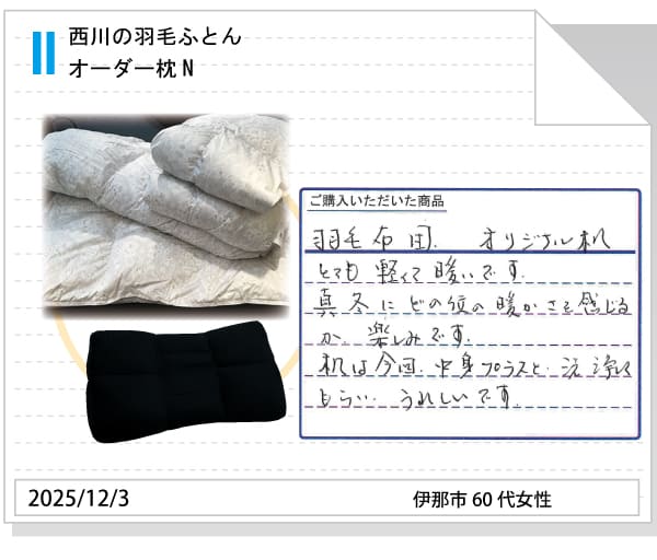 西川の羽毛ふとんをご愛用の長野県伊那市のお客様から喜びのお便りをいただきました。ありがとうございます!