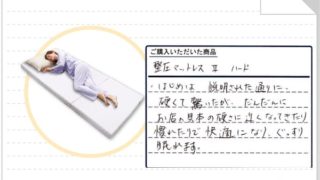 整圧マットレスⅡ・&freeをご愛用の長野県駒ヶ根市の60代女性のお客様から喜びのお便りをいただきました。ありがとうございます!-----投稿内容-----今まで使っていた布団だと起きた時に腰が痛かったりしたので、何か身体にいいマットレスがないかと思っていました。TVのコマーシャル等を見て迷っていたところ、思い切ってオ...